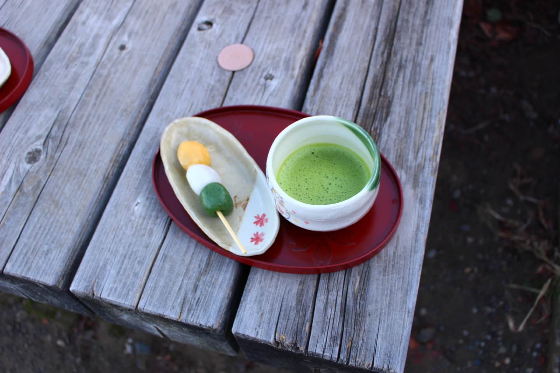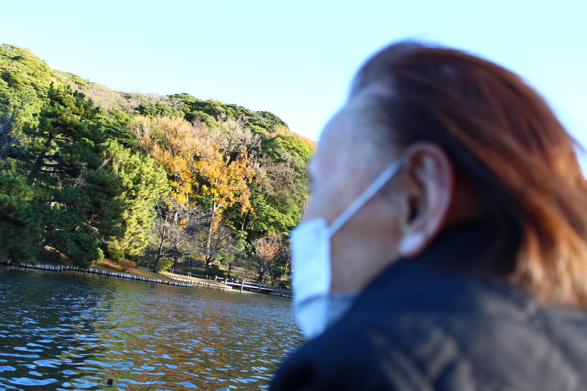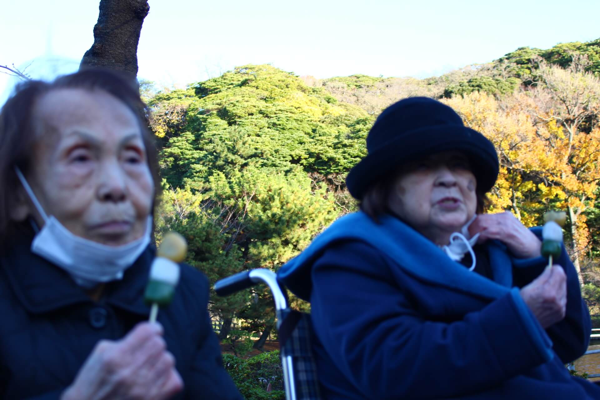 12月になりましても木々や草花はまだまだ色づいており、三溪園内にあります甘味処から紅葉を見ながら、温かい抹茶とお団子を召し上がられました。