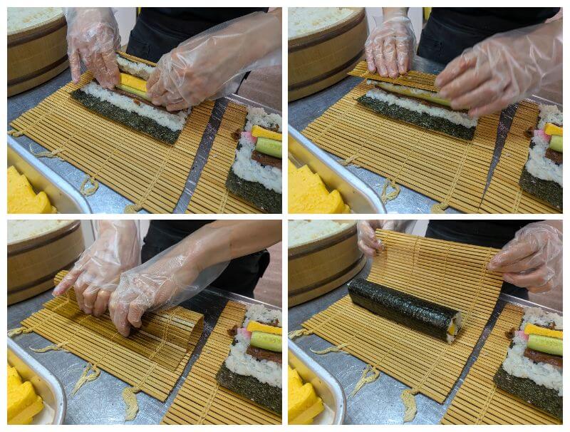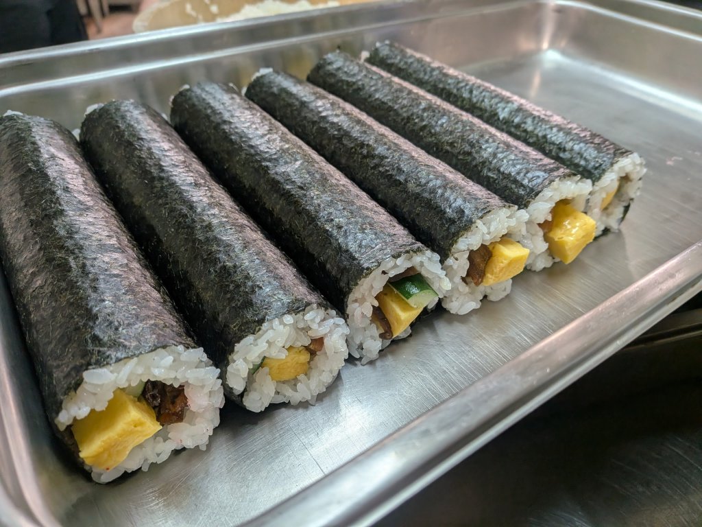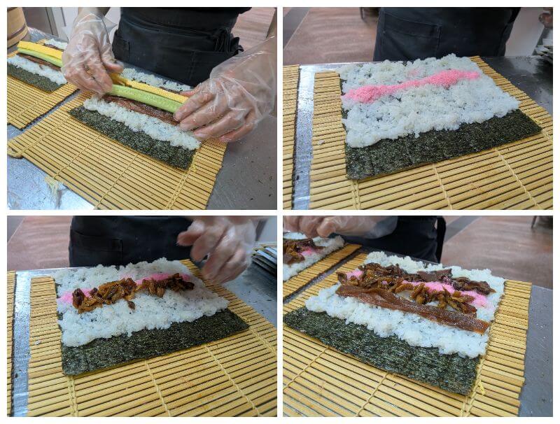 キュウリ・卵焼き・さくらでんぶ・シイタケ・煮あなご・干瓢を一本一本丁寧に巻きあげました🍙