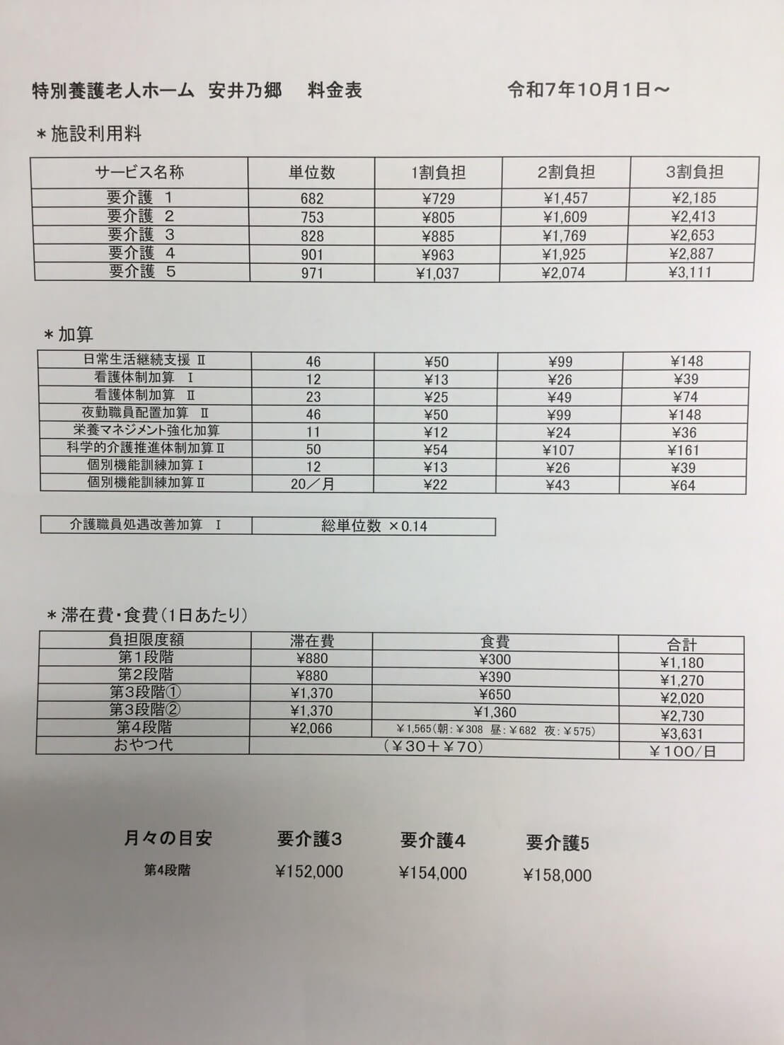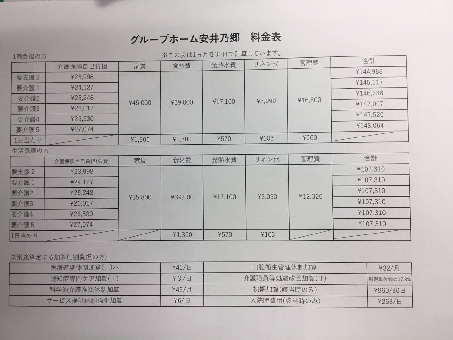 その他:医療費、オムツ代(使用される方)、お小遣い等がかかります。 ※施設の体制、介護保険法の改正等により、料金の変更を行う場合がございます。 ※敷金、礼金、一時入居金等はございません。