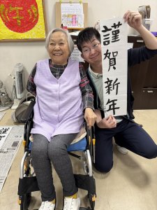 毎年恒例の書初め!利用者それぞれ書きたい文字を書かれていました。「やめとくよ。」「もう無理。」と遠慮がちな方も、筆を持つと皆さん真剣にスラスラと書かれていましたた。今年の干支である馬に関連した文字が多くありました!