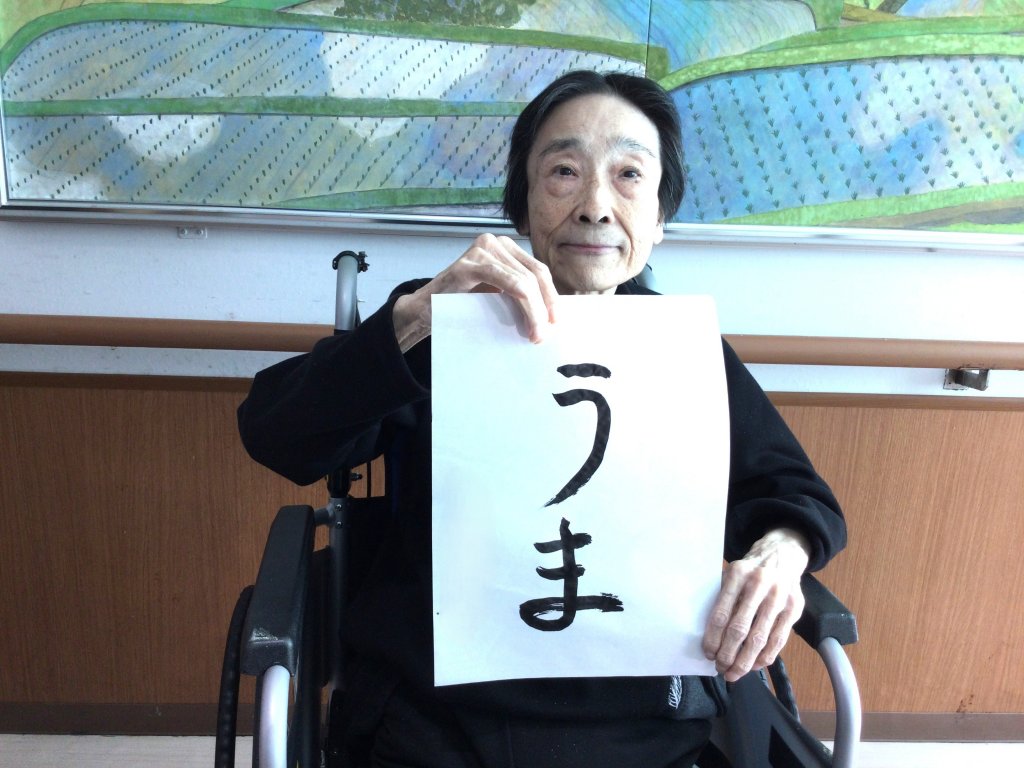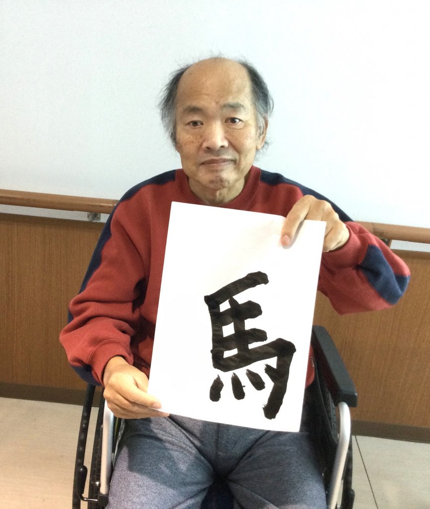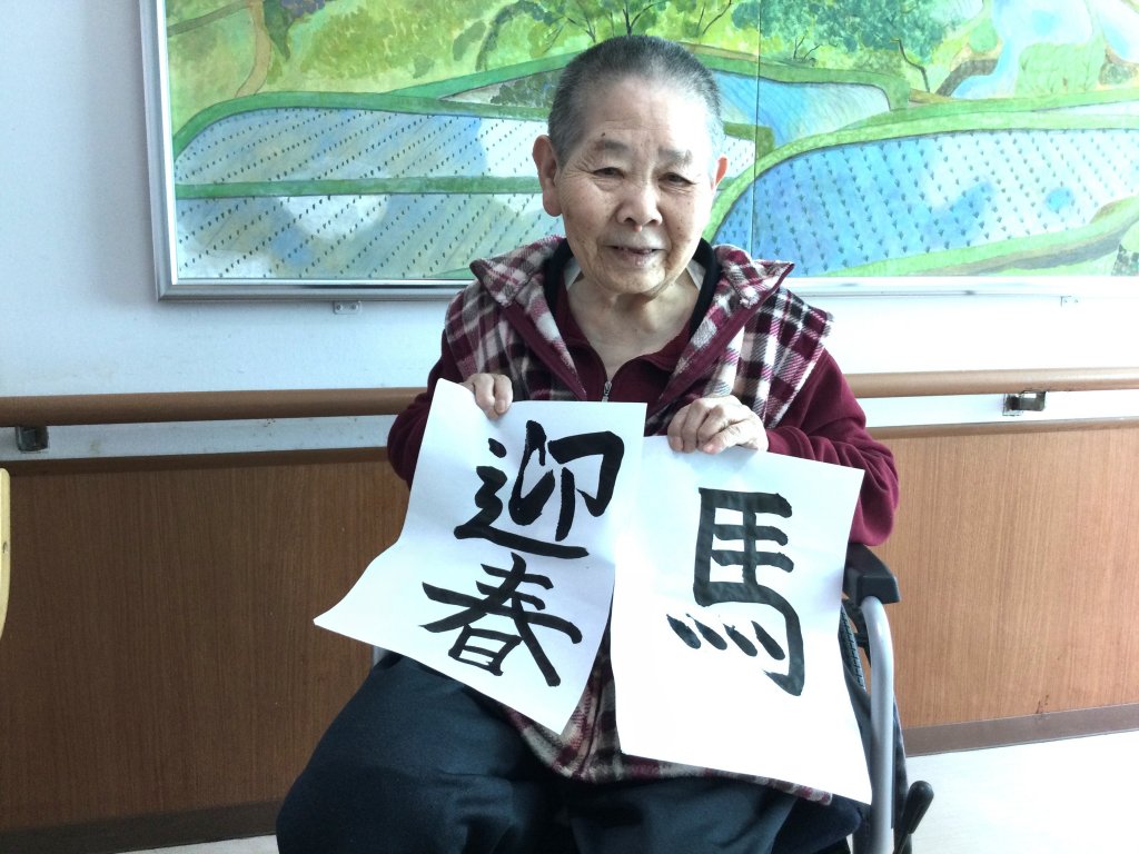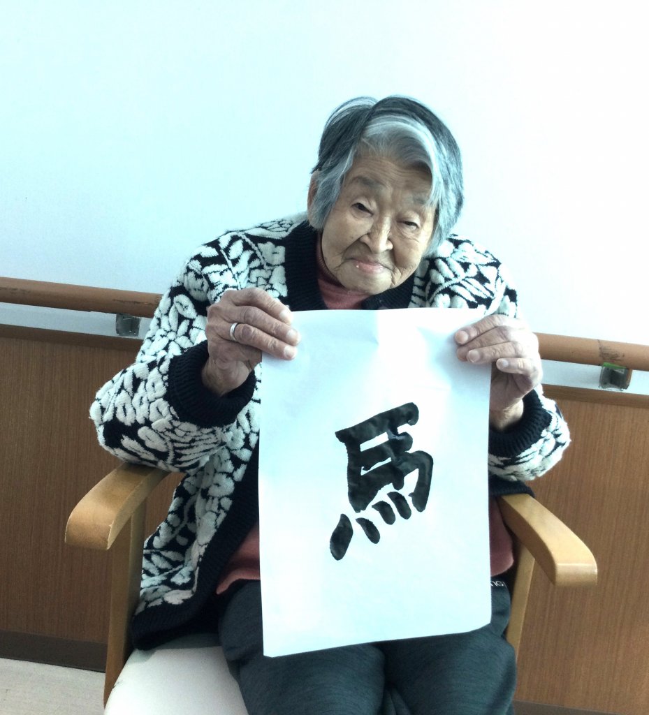 毎年恒例の書初め!利用者それぞれ書きたい文字を書かれていました。「やめとくよ。」「もう無理。」と遠慮がちな方も、筆を持つと皆さん真剣にスラスラと書かれていましたた。今年の干支である馬に関連した文字が多くありました!