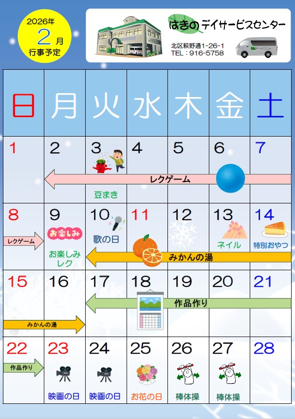 2月は、新企画「ネイル」が行われます。女性の利用者様はぜひご参加下さいね。また利用者様が輪になり顔を合わせて行う「お楽しみレクリエーション」も予定されています。一体感を楽しみながらゲームを行いましょう!まだまだ体にこたえる寒い日が続きますが、体調管理に努められ、お元気にはぎのへお越し下さいね。お待ちしております。