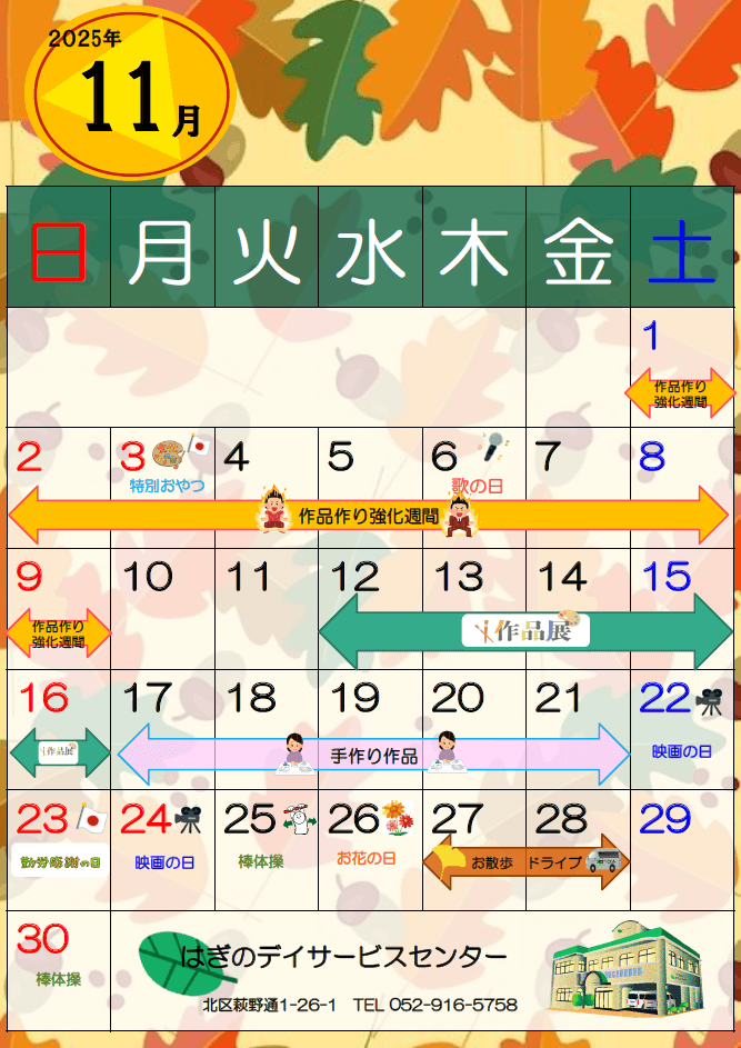 さて今月は、作品展の鑑賞やドライブなど、お出かけを予定しております。美しく色づいた木々の葉や晩秋の街並みなどを楽しんで頂ければと思います。今月も楽しみにはぎのへお越しくださいね。また1日の寒暖差が大きい時期となっていますので、感染症対策も含めて、体調管理に努めてくださいね。