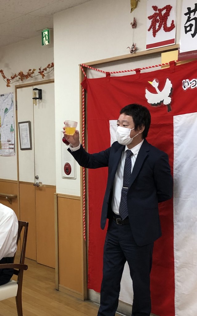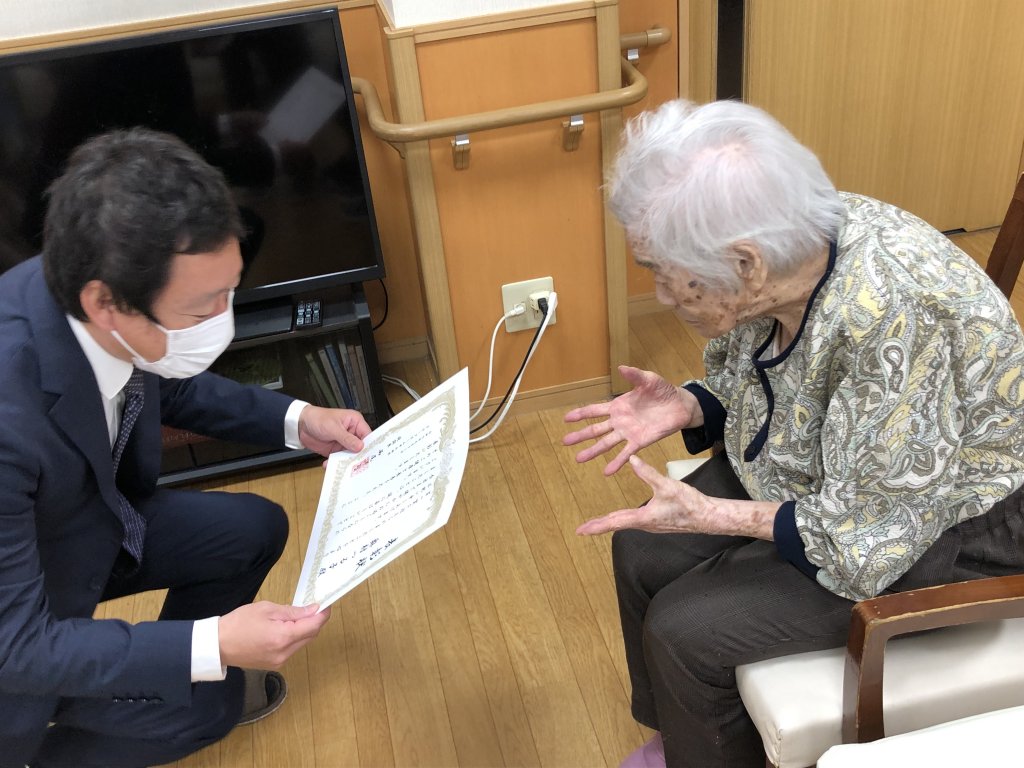 まずは施設長の挨拶から始まり長寿の方へお祝いで賞状を送らせていただきました。