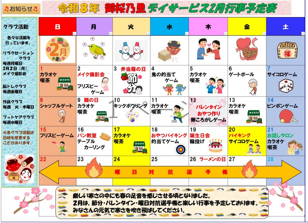 2月は、新企画「ネイル」が行われます。女性の利用者様はぜひご参加下さいね。また利用者様が輪になり顔を合わせて行う「お楽しみレクリエーション」も予定されています。一体感を楽しみながらゲームを行いましょう!まだまだ体にこたえる寒い日が続きますが、体調管理に努められ、お元気にはぎのへお越し下さいね。お待ちしております。